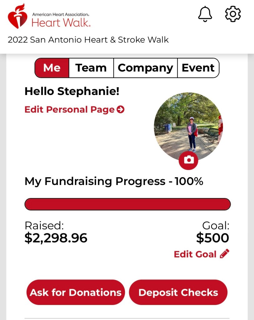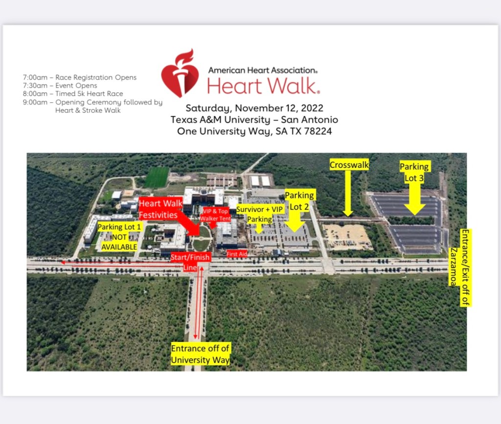 Now that I knew the AHA -American Heart Association had an annual 5k in San Antonio., I was much more prepared this year. I looked up the date and found out it was going to be held on November 12, 2023 at Texas A&M San Antonio campus. I registered early and sent out a link to family and friends asking for donations and participation to support the AHA and me. I also asked and encouraged my rehabilitation clinic to participate and bring the survivors to the walk. I could not believe this was something they weren’t already promoting for their inpatient or outpatient facility for survivors and their family members.